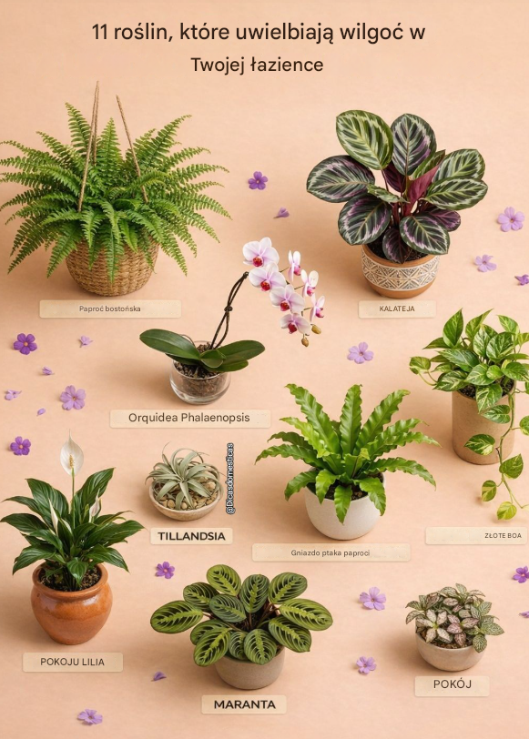 Paproć bostońska – Charakteryzuje się długimi, łukowato opadającymi liśćmi, które doskonale reagują na stałą wilgoć w powietrzu. Para wodna z kąpieli sprzyja jej wzrostowi i zapobiega przesuszaniu końcówek liści.