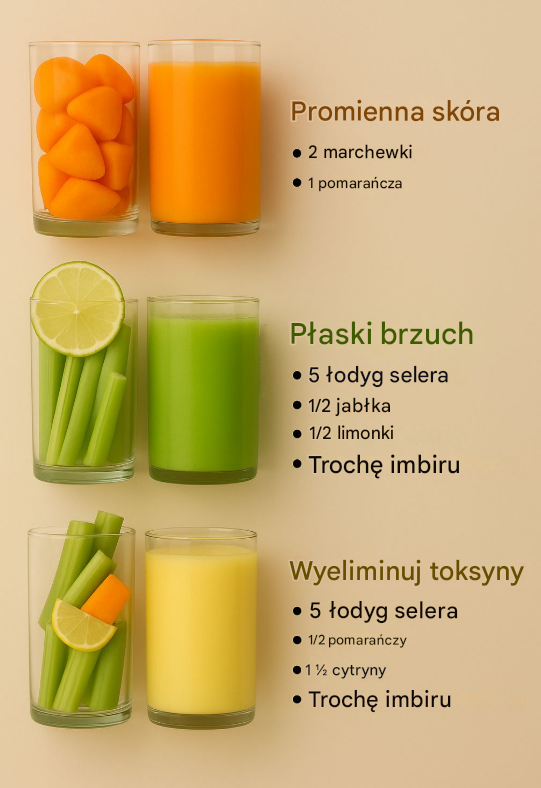 Poniżej znajdziesz trzy popularne propozycje soków, inspirowane naturalnym podejściem do zdrowia. Każdy z nich ma inny cel, ale wszystkie łączy prostota przygotowania i przyjemny smak. To rozwiązania, które łatwo włączyć do porannej rutyny.