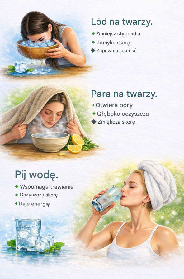 Krótkie opłukanie twarzy chłodną, a nawet lekko zimną wodą może przynieść szybkie uczucie świeżości. Taki kontakt z wodą pomaga delikatnie obudzić skórę, zmniejszyć lekkie poranne opuchnięcia oraz poprawić jej napięcie. Jest to szczególnie przyjemne po przebudzeniu lub po długim dniu, kiedy twarz wydaje się zmęczona.