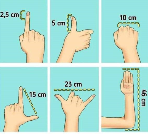- około 23 cm – odległość między czubkiem kciuka a czubkiem małego palca, gdy dłoń jest zaciśnięta w pięść, ale palce są rozwarte,