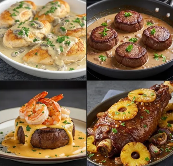 Poniżej znajdziesz cztery niezwykle apetyczne przepisy, które łączą w sobie prostotę wykonania, elegancję podania oraz bogactwo smaku. Są to dania sycące, a jednocześnie efektowne: piersi z kurczaka w kremowym sosie pieczarkowym, medaliony wołowe smażone na patelni, filet wołowy z krewetkami w stylu „ląd i morze” oraz golonka wieprzowa duszona z karmelizowanym ananasem. Każdy z tych przepisów sprawdzi się zarówno na rodzinny obiad, jak i na bardziej uroczystą kolację.