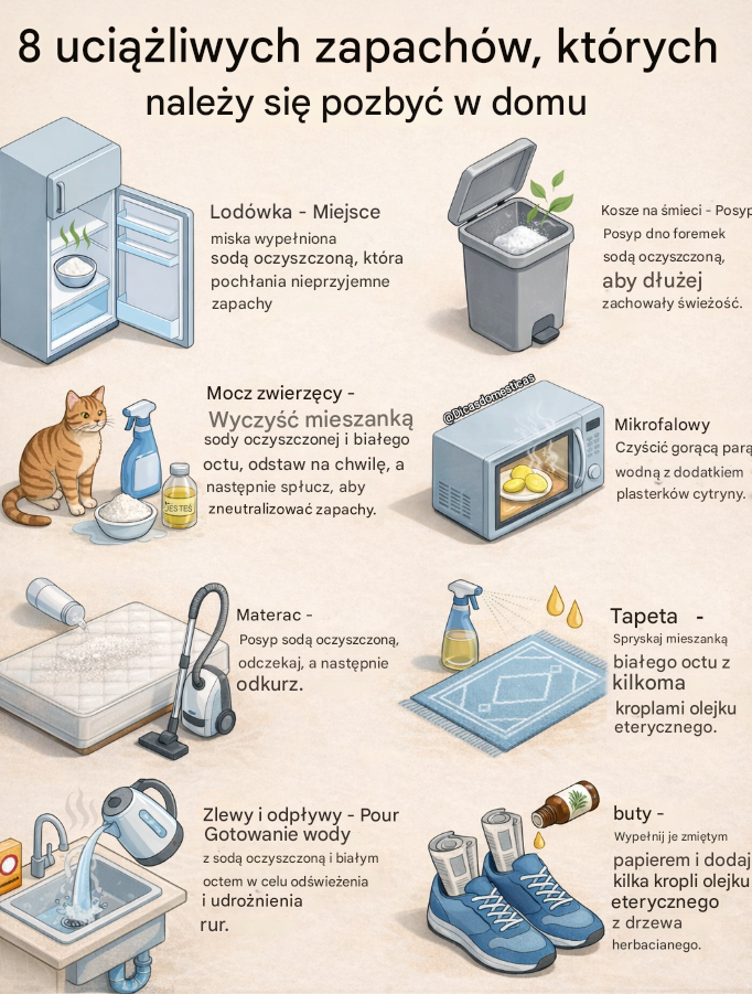 Połączenie sody i octu neutralizuje zapach, zamiast go maskować, co jest kluczowe przy tego typu zabrudzeniach.