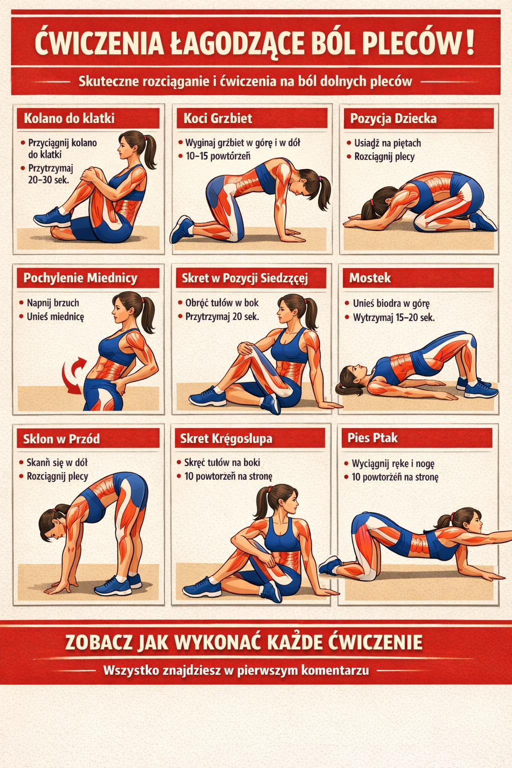 Ból pleców potrafi naprawdę uprzykrzyć życie. Trudno wtedy normalnie pracować, wygodnie spać, a czasem nawet schylić się po coś z podłogi bez uczucia sztywności czy kłucia. W większości przypadków przyczyny są dość prozaiczne: długotrwałe siedzenie, mało ruchu, przykurczone biodra oraz osłabione mięśnie, które powinny stabilizować kręgosłup – przede wszystkim brzuch, pośladki i mięśnie grzbietu.