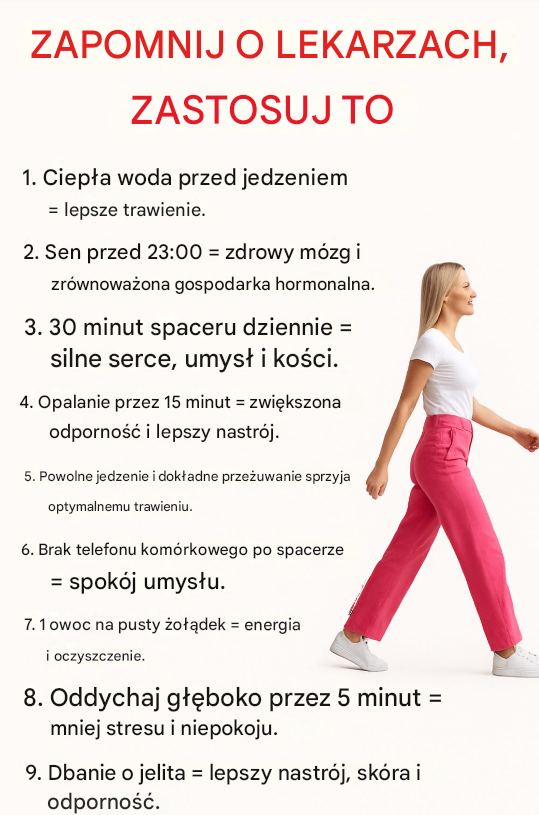 Poniżej znajduje się dziewięć prostych nawyków, które można wdrażać bez presji i bez rewolucji w życiu. Kluczem jest regularność i uważność na sygnały płynące z ciała. Każdy z tych kroków działa samodzielnie, ale razem tworzą solidne podstawy dla lepszego samopoczucia fizycznego i psychicznego.