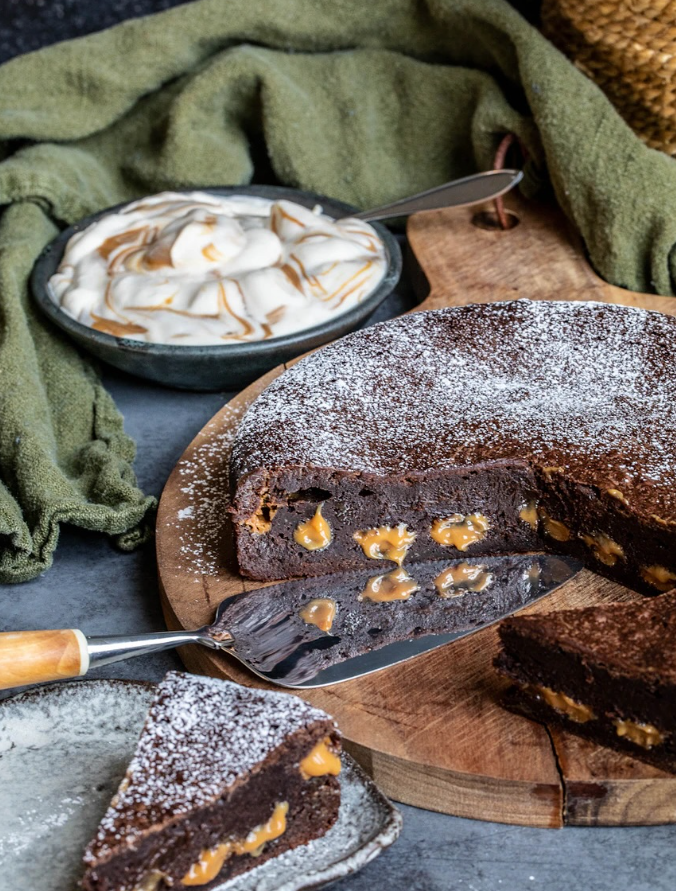 Kladdkaka może być naprawdę różnorodna, wypełniona mnóstwem pyszności i ozdobiona dodatkami, które uwielbiamy. Oto jedna z moich ulubionych wersji – biszkopt z dulce de leche i kremowym nadzieniem karmelowym! Jeśli chcesz zaszaleć, podaj go z dodatkową warstwą kremu dulce de leche! Dulce de leche to karmelizowane mleko skondensowane, z którego powstaje niesamowicie pyszny krem karmelowy, który można znaleźć na tylnej półce sklepu. Jest to prawdziwa rozkosz dla podniebienia!