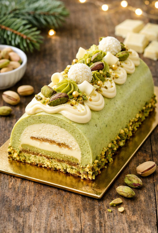 Ta bûche pistacjowo-czekoladowa z białą czekoladą to wyjątkowo elegancki, a jednocześnie delikatny deser, który doskonale sprawdzi się na święta, rodzinne uroczystości lub inne wyjątkowe okazje. Połączenie aromatycznej pistacji, aksamitnej białej czekolady i lekkiej musu tworzy harmonijną całość, która zachwyca zarówno smakiem, jak i wyglądem.