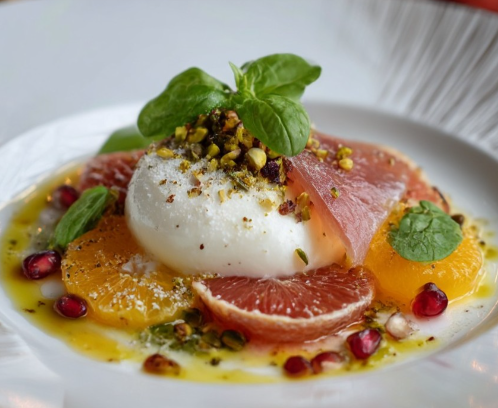 Kontrast temperatur, faktur i smaków jest tutaj kluczowy: chłodna burrata, aromatyczna oliwa, słodko-kwaskowe cytrusy i granat oraz lekko maślane pistacje tworzą harmonijną, a jednocześnie wyrazistą całość. To przepis, w którym liczy się precyzja, ale nie pośpiech.