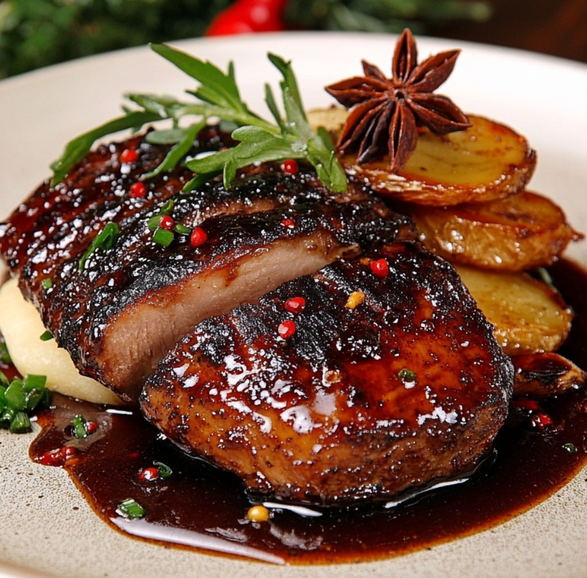 Dzięki zastosowaniu melasy, sosu sojowego i octu jabłkowego powstaje głęboki, lśniący sos, który idealnie otula soczyste mięso kaczki. Całość uzupełniają ziemniaki grenaille podsmażone na złoto oraz aromatyczne dodatki, takie jak anyż gwiazdkowy, estragon i różowy pieprz.