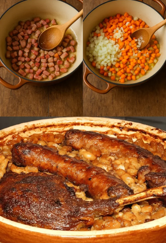 Każdy składnik pełni określoną rolę: fasola chłonie aromaty mięs, tłuszcz z kaczki nadaje głębi i aksamitności, a długi czas gotowania zapewnia idealnie miękką konsystencję oraz spójną strukturę smaku.