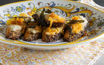 - Mozzarella. Pokrój mozzarellę na sześć plasterków. Trzy z nich porwij na mniejsze kawałki i równomiernie rozłóż na kromkach posmarowanych harissą.