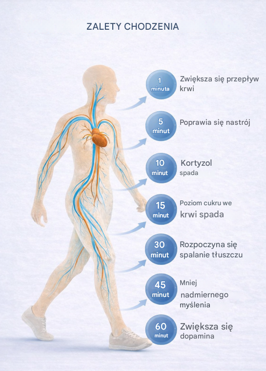 Poniżej znajdziesz rozbudowany opis tego, jak regularna, spokojna lub umiarkowana aktywność w postaci chodzenia wpływa na organizm i samopoczucie, nawet jeśli trwa stosunkowo krótko.