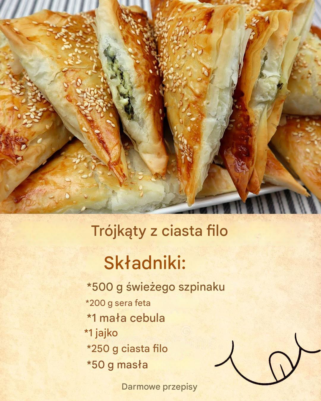 Trójkąty z ciasta filo ze szpinakiem i serem to klasyczna, wytrawna przekąska inspirowana kuchnią śródziemnomorską. Delikatne, niemal papierowe ciasto filo po upieczeniu staje się wyjątkowo chrupiące, a w środku kryje aromatyczne, kremowe nadzienie ze szpinaku i sera. To doskonały wybór zarówno na elegancką przystawkę, jak i na lekką kolację, przekąskę imprezową czy dodatek do zupy.