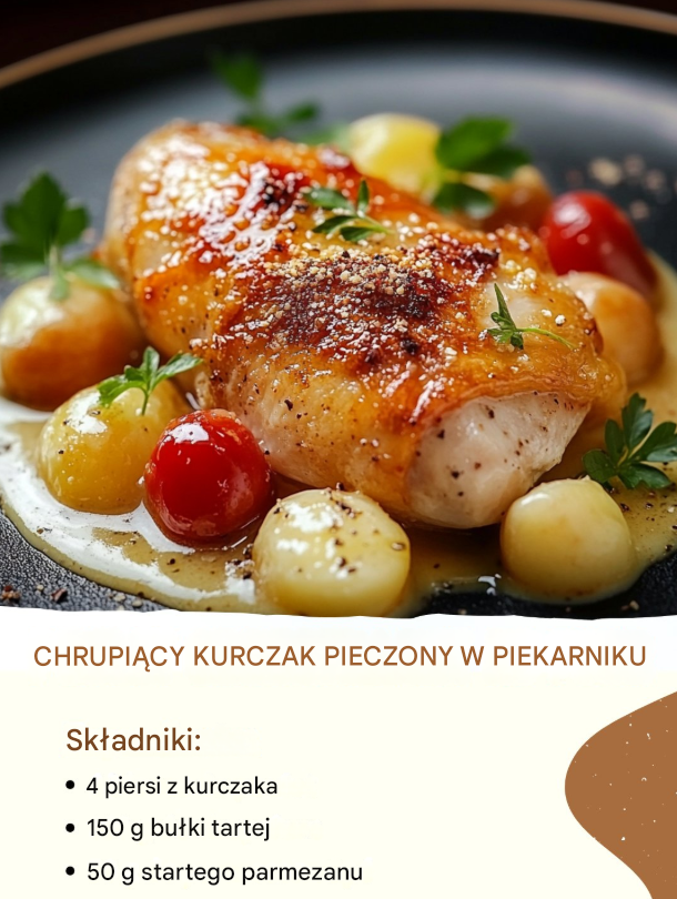 Chrupiący kurczak pieczony w piekarniku to doskonała alternatywa dla smażonych potraw – zachowuje złocistą, chrupiącą panierkę, a jednocześnie jest lżejszy i bardziej przyjazny dla codziennej kuchni. Ten przepis łączy soczyste piersi kurczaka z aromatyczną panierką z bułki tartej i parmezanu, wzbogaconą klasycznymi przyprawami, które nadają całości głębi smaku.