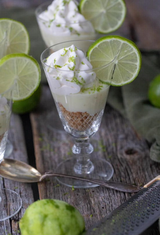 Połączenie kruchych herbatników, aksamitnego kremu limonkowego i puszystej bitej śmietany daje doskonałą równowagę pomiędzy słodyczą a orzeźwiającą kwasowością. Przepis jest przewidziany na cztery porcje, ale bez problemu można go podwoić lub potroić, jeśli planujesz większe spotkanie.