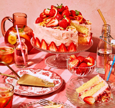 Biszkopty nasączone syropem cytrynowym są wilgotne i aromatyczne, a warstwy lukru i świeżych truskawek nadają deserowi świeżości. Całość dopełniają kandyzowane skórki cytrynowe oraz opcjonalne strzelające cukierki, które wprowadzają element zaskoczenia i dodatkową teksturę.