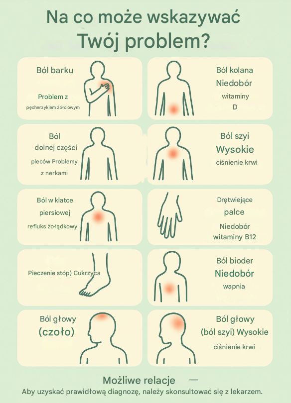 Poniżej przedstawiamy najczęstsze miejsca bólu oraz to, co mogą one sugerować w kontekście ogólnego stanu zdrowia. Traktuj te informacje jako wskazówkę, a nie diagnozę — kluczową rolę zawsze odgrywa konsultacja z lekarzem.