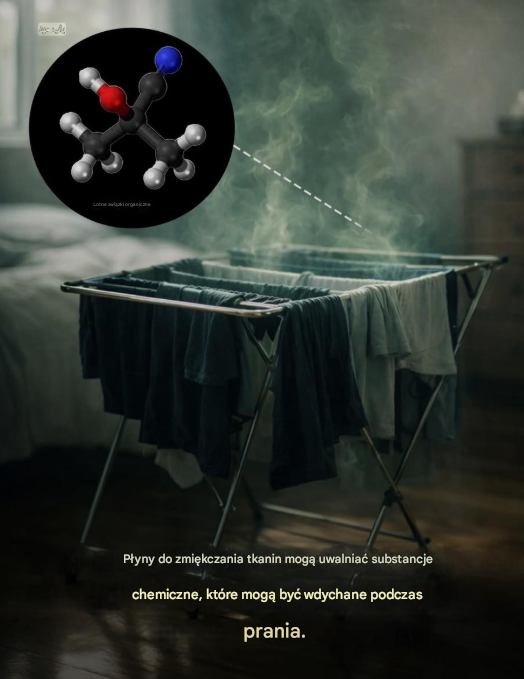 Podczas prania, a zwłaszcza suszenia ubrań, płyny do płukania uwalniają do powietrza różne substancje chemiczne, w tym lotne związki organiczne (LZO). Pochodzą one głównie z kompozycji zapachowych oraz dodatków chemicznych, które mają sprawić, że ubrania będą pachniały „świeżo” przez długi czas.