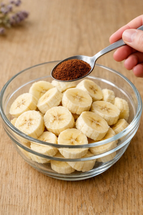 Do rozgniecionych bananów dodaj niesłodzone kakao i dokładnie wymieszaj, aż składniki całkowicie się połączą. Na tym etapie możesz również dodać ekstrakt waniliowy oraz szczyptę cynamonu, które delikatnie podkręcą smak i nadadzą deserowi cieplejszy aromat.
