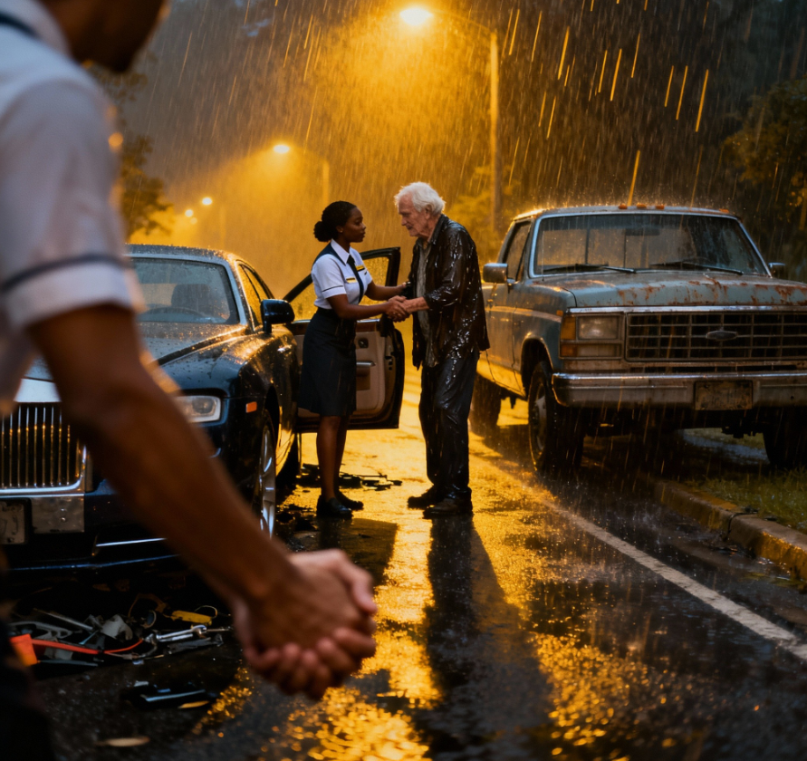 Zwolniła. W świetle reflektorów dostrzegła sylwetkę starszego białego mężczyzny stojącego obok auta. Płaszcz miał kompletnie przemoczony, jedną ręką opierał się o błotnik, próbując utrzymać równowagę. Nie było parasola, nie było nikogo do pomocy – tylko mokry garnitur i zmęczona twarz wpatrzona w deszcz.