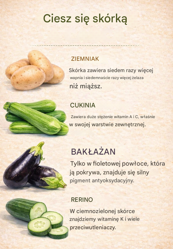 Witaminy i antyoksydanty znajdujące się w zewnętrznych warstwach warzyw pomagają chronić komórki przed stresem oksydacyjnym i wspierają naturalne mechanizmy obronne organizmu. Usuwając skórkę, często pozbawiamy się tej najcenniejszej części produktu.