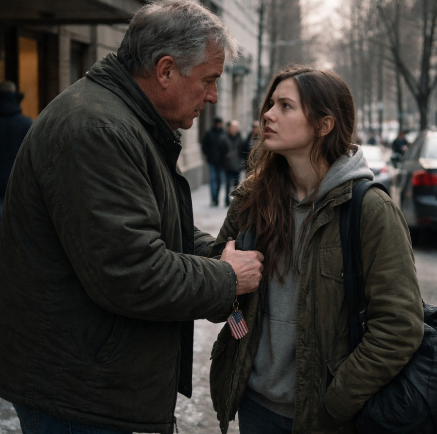 Na krawężniku stał mój dziadek. Idealnie skrojony wełniany płaszcz, szalik zawiązany tak, jakby nadal wierzył, że kontrola potrafi naprawić wszystko. Za nim cicho pracował czarny luksusowy sedan. Na bagażniku widniał mały magnes z amerykańską flagą — jaskrawy, uparty detal, bardziej pasujący do czwartego lipca niż do poranka pod schroniskiem. A jednak tam był. Jakby machał do mnie bez słów.