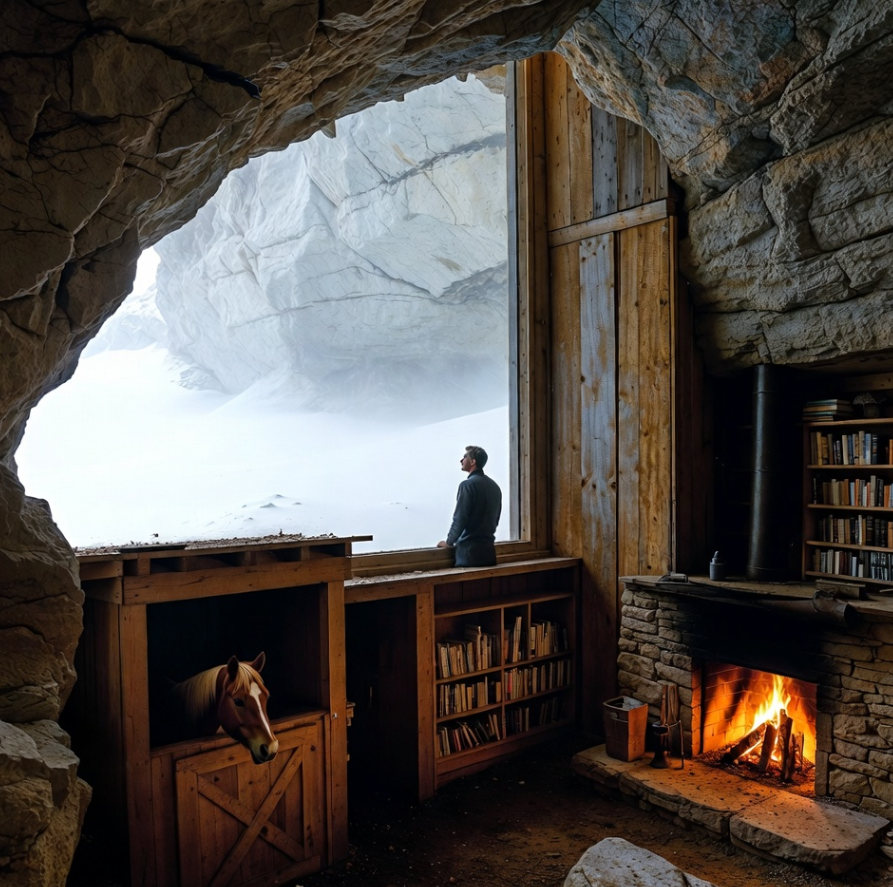 Poprowadził konia dalej, przez wąski korytarz wejściowy, do większej komory, w której stała jego kabina — solidna drewniana konstrukcja zbudowana w całości wewnątrz jaskini, osłonięta milionami lat kamienia nad i wokół niej. Drzwi znajdowały się dwadzieścia stóp od wejścia, tworząc strefę buforową.