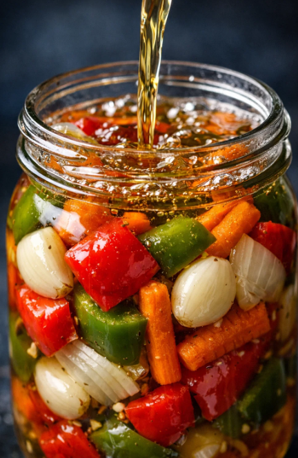 Domowe warzywa marynowane, znane również jako kolorowe pickles, to wyjątkowo apetyczna, aromatyczna i przyjemnie chrupiąca propozycja, która doskonale sprawdzi się przez cały rok. Połączenie papryki, marchewki, cebuli oraz delikatnie pikantnej papryczki zanurzone w lekko kwaśnej, zbalansowanej zalewie tworzy kompozycję pełną świeżości i koloru.
