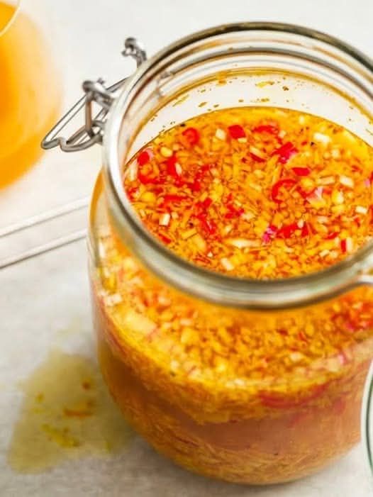 Zalej zawartość słoika octem jabłkowym tak, aby wszystkie składniki były całkowicie zanurzone. To bardzo ważne, ponieważ zapobiega psuciu się mieszanki.