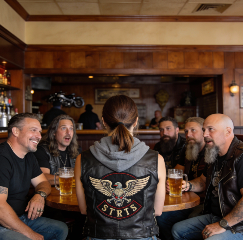 Rusted Spur stał samotnie przy autostradzie, niski, drewniany bar przyklejony do krawędzi Route 41, tam gdzie ciężarówki zwalniały, a kłopoty rzadko przepraszały. W środku wisiał ciężki dym, szkło brzęczało, a mężczyźni z motocyklowego klubu Steel Vultures wypełniali salę zapachem skóry, bliznami i hałasem. Byli już starsi — siwe brody mieszały się z żelaznymi tatuażami — ale reputacja wciąż trzymała większość ludzi na dystans.