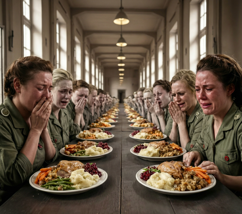 Poprowadzono je do stołówki — bez pośpiechu, bez krzyków. Marsz był spokojny, niemal ceremonialny. Gdy weszły do środka, wiele z nich zatrzymało się w pół kroku.