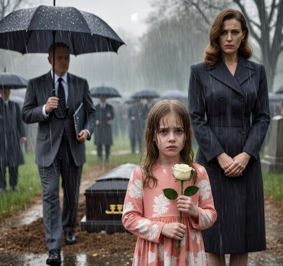 Ośmioletnia Emily Carter stała obok swojej macochy, ściskając wilgotną białą różę. Jej drobne palce drżały, a ramiona były napięte. Była za mała, by pojąć śmierć w całej jej ostateczności, ale wystarczająco duża, by poczuć ostrą pustkę, która pojawia się zaraz po niej — pustkę, której nie da się niczym wypełnić.