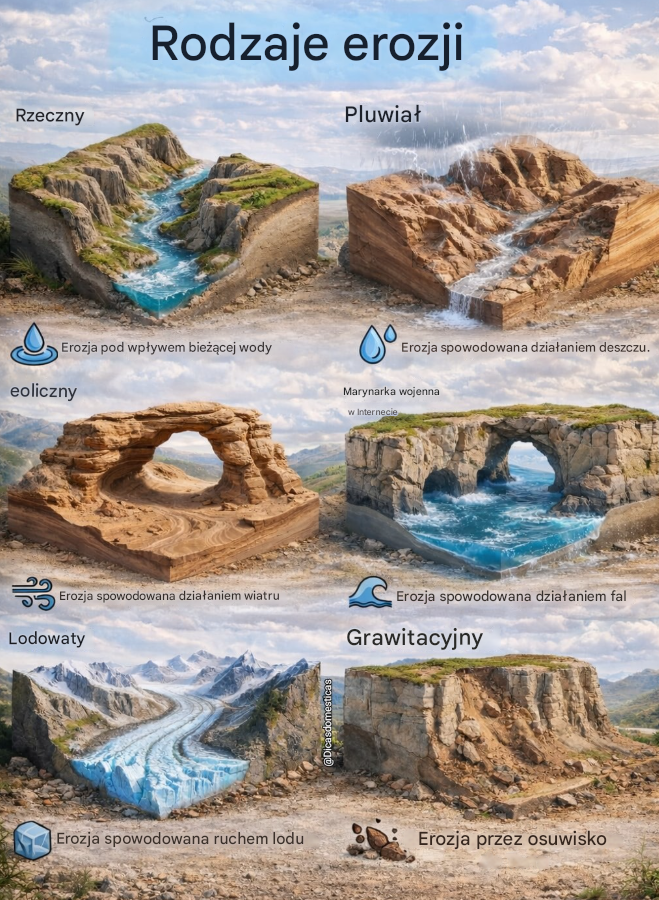 Poniżej przedstawiono najważniejsze rodzaje erozji, które różnią się mechanizmem działania, ale prowadzą do podobnych skutków – stopniowej utraty gleby i zmian w krajobrazie.