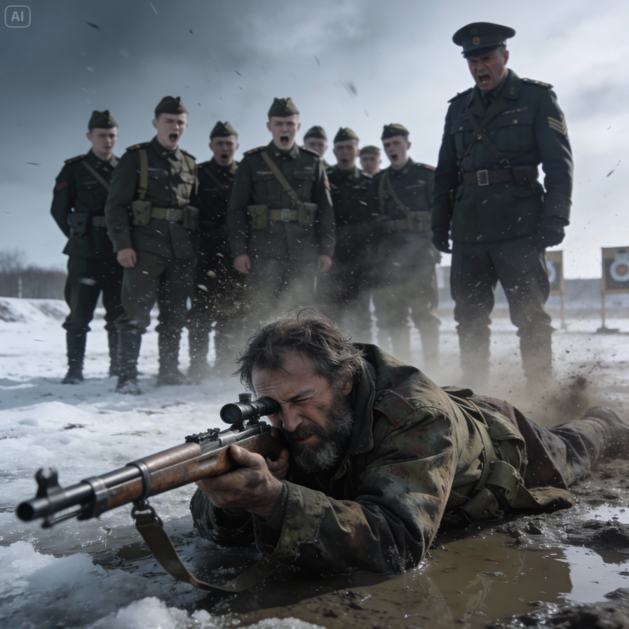 „Zróbmy to ciekawie” — uśmiechnął się. „800 metrów. Mocny boczny wiatr. Trafisz ten cel jednym strzałem z karabinu, którego nigdy nie dotykałeś — kupię ci porządny, ciepły posiłek.”