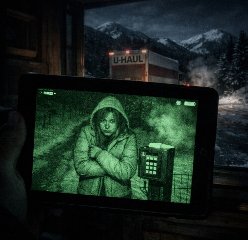 Nie wstałam. Nie spanikowałam. Jednym ruchem palca otworzyłam aplikację bezpieczeństwa na tablecie. Ziarnisty obraz z noktowizji pokazał moją siostrę, drżącą przy klawiaturze u dołu podjazdu. Nie była jednak sama. Za nią stała na biegu jałowym 26-stopowa ciężarówka U-Haul, wyrzucająca szare spaliny w krystalicznie czyste górskie powietrze.