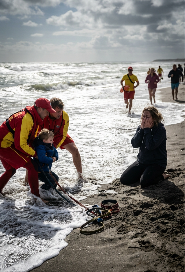 Stała sztywno, z nogami mocno wbitymi w suchy piasek. Jej postawa nie wyrażała troski, lecz kontrolę. Jej wzrok nie spoczywał na twarzy syna, lecz na wodzie, jakby ocean był wrogiem, którego należało trzymać na dystans.
