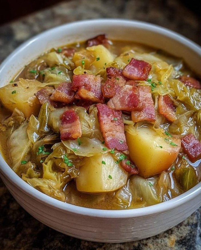 Przypraw całość solą (uważaj, bo bekon jest już słony) oraz świeżo zmielonym pieprzem. Delikatnie wymieszaj, aby składniki się połączyły, przykryj garnek pokrywką i zmniejsz ogień do minimum. Pozwól, aby wszystko dusiło się przez 35-40 minut, aż ziemniaki będą miękkie, a kapusta dobrze ugotowana i wchłonie smaki. Co kilka minut sprawdzaj, czy nie trzeba dodać odrobinę więcej wody – kapusta powinna się gotować na parze, a nie smażyć.