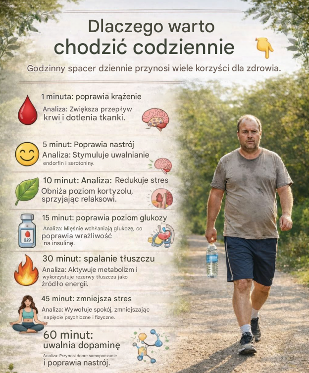 Chodzenie wydaje się czymś zupełnie prostym… a jednak w Twoim ciele zachodzi wtedy prawdziwa transformacja – zarówno fizyczna, jak i psychiczna. Regularna, codzienna godzina spaceru potrafi uruchomić procesy, których efektów wiele osób się nie spodziewa.