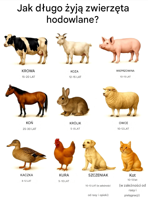 Jak długo żyją zwierzęta gospodarskie i co zrobić, by żyły dłużej? Poniżej znajdziesz krótką, praktyczną ściągę z przeciętną długością życia najczęściej spotykanych zwierząt hodowlanych oraz domowych, a także zestaw prostych zasad, które realnie wpływają na ich zdrowie i długowieczność.
