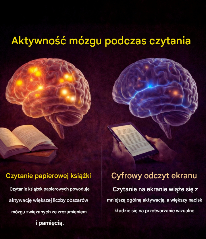 Analiza ta nie dotyczy jedynie preferencji estetycznych czy przyzwyczajeń czytelniczych, lecz odnosi się do biologicznych mechanizmów przetwarzania informacji. Sposób, w jaki odbieramy tekst, wpływa na koncentrację, zapamiętywanie oraz zrozumienie treści. Obraz stanowi więc punkt wyjścia do szerszej dyskusji o tym, jak różne nośniki wiedzy oddziałują na ludzki mózg.