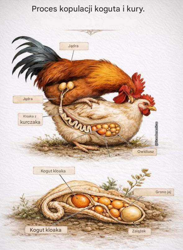 W organizmie koguta znajdują się jądra, których zadaniem jest produkcja plemników. Podczas kontaktu rozrodczego plemniki są uwalniane i przekazywane do organizmu kury. Choć proces ten trwa bardzo krótko, jest wystarczający, aby komórki rozrodcze mogły spełnić swoją funkcję.