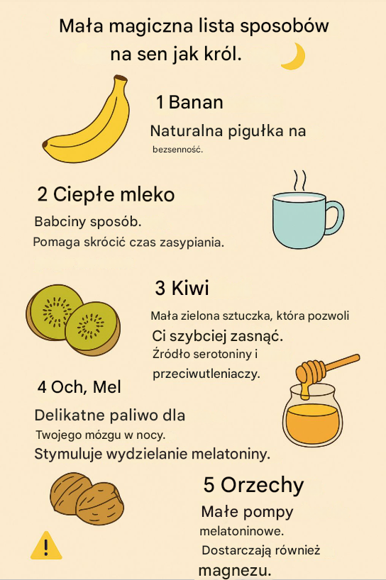 Banan bywa nazywany naturalną „pigułką” na bezsenność. Zawiera tryptofan — aminokwas biorący udział w produkcji serotoniny i melatoniny — oraz magnez, który wspiera rozluźnienie mięśni. Spożyty wieczorem może pomóc organizmowi płynnie przejść w tryb odpoczynku.