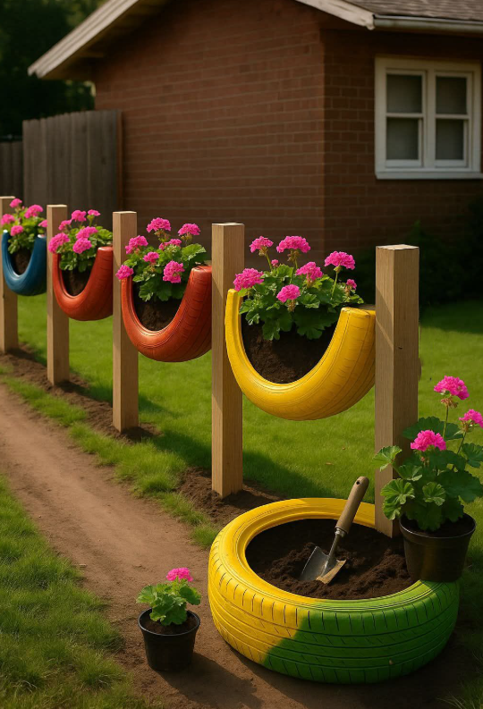🌿 Krok po kroku: kwietnik z opon na ogrodzeniu
