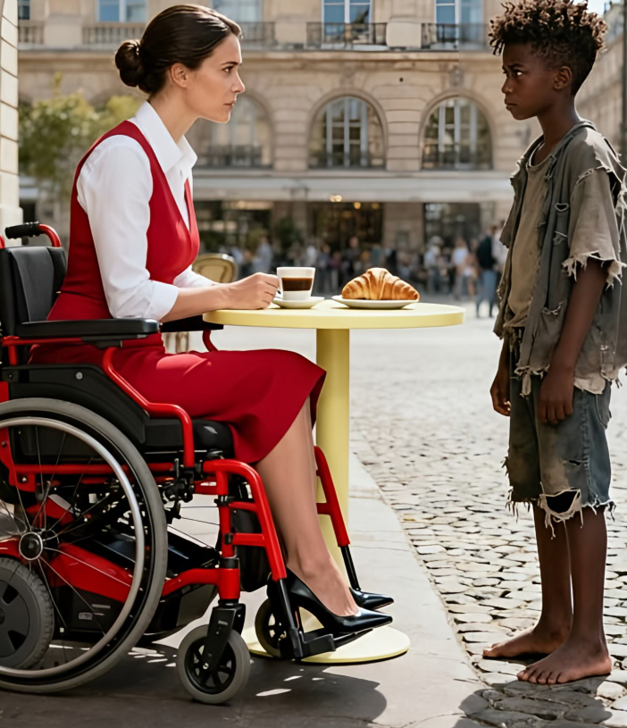 Błąkając się w pobliżu eleganckiej restauracji w Midtown, Jamal zatrzymał się na chwilę, by schronić się przed wiatrem. Przez duże okna dostrzegł kobietę na wózku inwalidzkim, siedzącą samotnie przy stoliku w rogu sali. Jej nienaganny, elegancki strój wyraźnie kontrastował z pustym talerzem stojącym przed nią. Oczy, pełne niewypowiedzianych emocji i ledwie powstrzymywanych łez, wpatrywały się w przestrzeń. Była to pani Lenora Whitman, niegdyś wpływowa postać świata finansów, która pięć lat wcześniej straciła władzę w nogach w tragicznym wypadku. W tym samym zdarzeniu zginął jej mąż, co pozostawiło w jej życiu pustkę trudną do wypełnienia.