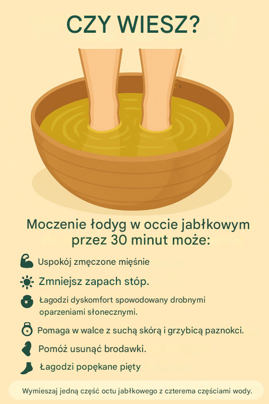 Kąpiel stóp z dodatkiem octu jabłkowego to naturalny rytuał pielęgnacyjny, który od lat stosowany jest w domowej profilaktyce. Nie wymaga drogich kosmetyków ani skomplikowanych zabiegów – wystarczy kilka minut przygotowania i chwila relaksu, aby stopy odzyskały lekkość i świeżość 🌿✨
