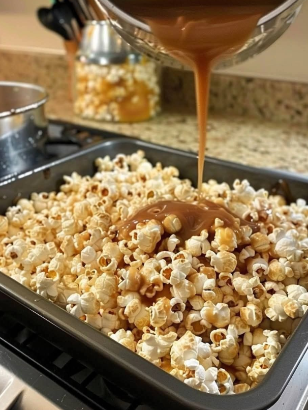 Gotowy, uprażony popcorn wsyp do dwóch płytkich, natłuszczonych foremek do pieczenia. Mogą to być klasyczne blachy, foremki do rolady lub większe foremki jednorazowe. Ważne, aby popcorn miał miejsce do swobodnego mieszania.