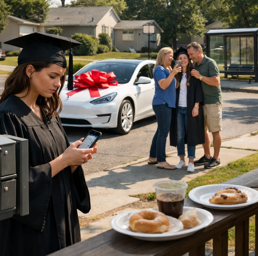 Tymczasem kilka domów dalej moi rodzice zamienili podjazd w plan zdjęciowy. Perłowo-biała Tesla stała ustawiona pod idealnym kątem, z ogromną czerwoną kokardą rozciągniętą na masce jak obietnica. Moja siostra Amber śmiała się w zwiewnej sukience, włosy miała ułożone, telefon już w dłoni. Mama poprawiała wstążkę z powagą kogoś, kto stroi wystawę sklepową, a tata uruchomił swój „wielki moment” – głośno mówił o bezpieczeństwie i kamieniach milowych tak, by sąsiedzi słyszeli każde słowo.