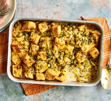 To nadzienie na Święto Dziękczynienia jest klasyczne, ale jednocześnie niezwykle bogate w smak. Przygotujesz je z prostych, łatwo dostępnych składników, a jego bazą jest czerstwy chleb, który idealnie chłonie aromaty masła, ziół i bulionu. Możesz użyć dowolnego rodzaju chleba, jednak chleb na zakwasie sprawdza się szczególnie dobrze, nadając całości lekko wytrawny, głęboki smak.