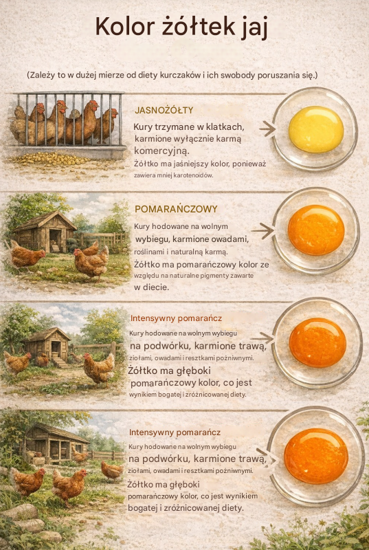 Blady, jasnożółty kolor żółtka najczęściej występuje w jajach pochodzących od kur hodowanych w klatkach i karmionych głównie paszą przemysłową. Tego typu dieta jest zazwyczaj uboga w naturalne pigmenty, takie jak luteina czy beta-karoten, co skutkuje jaśniejszym zabarwieniem żółtka.