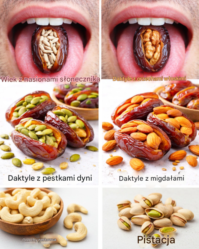 Poniżej przedstawiono popularne połączenia daktyli z różnymi rodzajami orzechów i nasion, wraz z ich praktycznymi zaletami. Wszystkie te kombinacje mogą być spożywane jako samodzielna przekąska, dodatek do posiłków lub element diety osób dbających o świadome odżywianie.