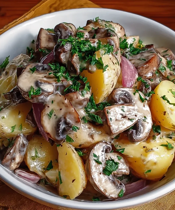 Jeśli szukasz pomysłu na sycącą, a jednocześnie prostą w przygotowaniu potrawę bez mięsa, ta kremowa sałatka z ziemniaków i pieczarek będzie doskonałym wyborem. To roślinna interpretacja klasycznych, kremowych sałatek, która łączy w sobie delikatność ziemniaków, intensywny smak podsmażonych pieczarek oraz aksamitny sos na bazie majonezu i jogurtu. Danie jest uniwersalne, komfortowe i bardzo przyjazne dla domowej kuchni – sprawdzi się zarówno na co dzień, jak i przy okazji spotkań rodzinnych czy niewielkich przyjęć.